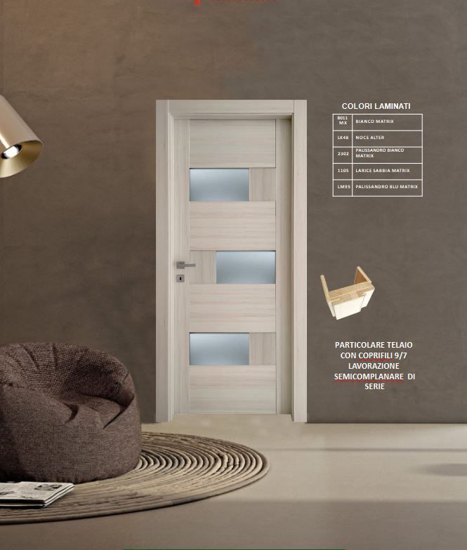 Telaio raggio 3 larghezza standard con supporto in listellare e coprifili 90*10 ala 20 lato spingere + 65*10 ala 20 lato a tirare con supporto in multistrato. Guarnizione antirumore in PVC nel telaio.